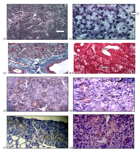 | Figure 2: Photomicrographs of rat submandibular gland of control groups showing regular structured acini (arrows) (A1, H&E ×100; A2, H&E ×400). The collagen fibers are distributed in the stroma between the acini and duct (A3, Trichrome ×100). Strong positive PAS reaction in striated duct (upper arrow) and acini (lower arrow) which is observed more at their basement membrane (A4, PAS ×400). Moderate Ki-67 immuno reactivity in nuclei of cells of ducts and some acini in the first and second group respectively (A5, A6), and moderate cytoplasmic reaction to Bcl-2 mostly seen in association with duct’s cells in the first and second group respectively (A7, A8), (immunohistochemistry ×400). |
