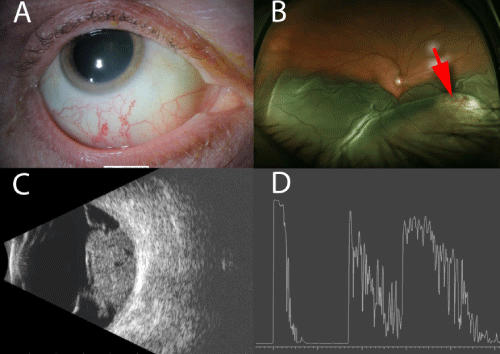 | Figure 2: External photograph of the right eye. Engorged corkscrew vessles are present along the inferior aspect of the globe (A). Wide field fundus image reveals a serous retinal exudate from 3-9 o´clock. A large mass with intrinsic vasculature (arrow) is visualized under the detached retina (B). ). Ultrasonography revealed a lobulated lesion with medium high internal reflectivity anteriorly and low reflectivity posteriorly. The retina was shallowly detached over portions of the lesion. Echolucent pockets and a positive angle kappa was observed. (Figure 3C-D). |