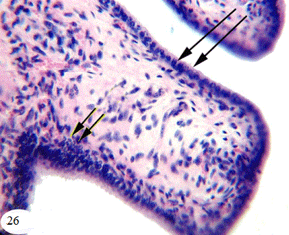 | Figure 26: High magnification to the squares area illustrated in (Figure 25b) showing the simple linning epithelium of the duct "long arrow, and the conversion of the linning epithelium to stratified linning epithelium (short arrow). Stain: H&E Obj. x40: Oc.x10 |