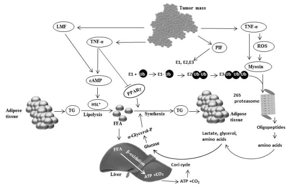 | Figure 2: Molecular mechanism responsible for the loss of adipose tissue and skeletal muscle during cancer associated cachexia. The production of cancer associated factors and cytokines e.g. lipidmobilizing factor (LMF), tumor necrosis factor (TNF)-α and proteolysis-inducing factor (PIF). The increased levels of TNF-α and LMF in tumor patients results in the hydrolysis of triglycerides in adipose tissues through the breakdown of cyclic AMP (cAMP) that, in turn, reduces the activation of hormone-sensitive lipase (HSL). Also, high level of TNF-α can suppress the peroxisome proliferator-activated receptor γ (PPARγ) and subsequently inhibits the biosynthesis of TG. Once TNF-α-induced free fatty acids (FFAs) enter the liver, the β-oxidation of FAA produces energy in the form of adenine triphosphate (ATP) in addition to the production CO2. ATP drives the cori cycle to convert lactate, glycerol, amino acids to glucose. The induction of proteolysis inducing factor (PIF) increases the production of proteasome subunits and thereby enhances protein degradation in skeletal muscle. |