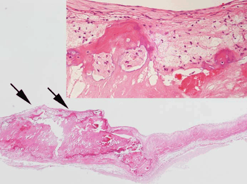 | Figure 2: Vessel-independent heterotopic ossification (arrow) in mildly to moderately calcified non-dysfunctional postmortem aortic valve. A high power view (inset) showing rim-like bones accompanied by aggregated foamy cells but without neovascularization. |