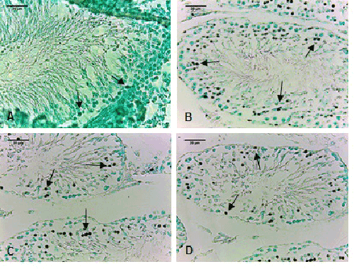 | Figure 3:Photomicrographs of TUNEL-stained testicular sections from controls (A) and rats exposed to 2 g/l of lead acetate (B, C, and D). Magnification 400x. Arrows indicated TUNEL-positive cells (spermatogonia; permatocytes I; spermatids) (A, B, C, D: Scale bar 20 μm) |