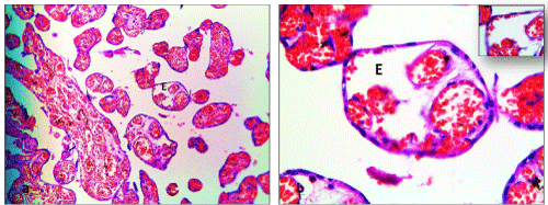 | Figure 3: Photomicrographs of diabetic group of placenta showing; a) A fullterm placenta includes sections of many villus stems (V), containing edema (E), (H&E 10X . b) At higher magnification, the villus connective tissue denoting edema (E), (H&E 40X).Inset |