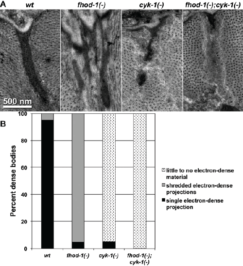 | Figure 5: (A) Z-lines of worms with the indicated genotypes are shown. A singular electron-dense body is seen in wild-type, while the FHOD-1(-) Z-line contains multiple, thinner bodies, and the CYK-1(-) and FHOD-1(-); CYK-1(-) Z-lines contain reduced amounts of electron-dense material. (B) Z-lines in worms with the indicated genotypes were visually categorized as containing: singular electron-dense bodies, multiple shredded electron-dense bodies, or very little to no electron-dense material. Results shown are representative of two independent experiments that scored twenty Z-lines of each strain. |