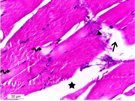 | Figure 5: Photomicrograph of a section in skeletal muscle of a rat of group II showing: wide separation of the skeletal myocytes (star), fragmentation (arrowhead) and marked disruption (arrow) of the skeletal muscle fibers. Some muscle fibers showed areas of hyalinization of the sarcoplasm (wavy arrows). Hx& E 400x. |