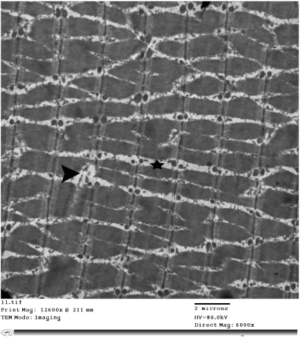 | Figure 20: Electron micrograph of a skeletal muscle of a vitamin E-treated rat with relatively normal pattern and arrangement of the myofibrils and decreased intermyofibrillar space (star). Note: focal area of degenerated myofibrils (arrow head). X60000. |