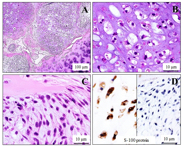 | Figure 2: Microscopic and immunohistochemical examination of the high-grade chondrosarcoma with spindle cell components arising from the cricoid cartilage. (A) Low-power view (H&E stains) showed that its multi-lobulated parts were composed of a solid proliferation of atypical chondrocyte-like cells, embedded in an abundant and basophilic chondroid matrix, very likely originated from the mature-looking cricoid cartilage (lower rt.). Bar=100 μm. (B) High-power view demonstrated that these neoplastic cells had a small to medium-sized and round shape, displaying hyperchromatic bi- or multi-nuclei, inconspicuous nucleoli, abundant clear vacuolated cytoplasm, and indistinct cellular borders (H&E stains). Bar=10 μm. (C) These neoplastic lobules coexisted with cellular spindled cell foci in part. Bar=10 μm. (D) In immunohistochemistry, the atypical chondrocyte-like cells were specifically positive for S-100 protein (lt.), but the atypical spindle cells were not (rt.) Bar=10 μm. |
