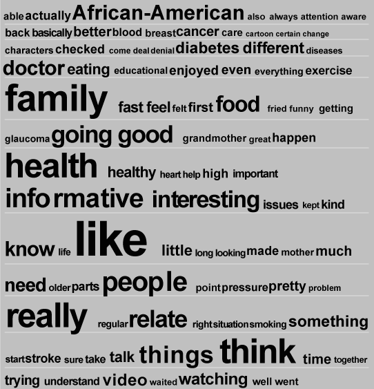 | Figure 1: Participant response to KUWW A word cloud encompassing the most common participant reactions to KUWW reveals on overall positive response to the series. Word size corresponds to how frequently a particular word was mentioned in post-viewing interviews. Study participants indicated enjoyment (‘like’), relevance (‘relate’), and the educational merit (‘informative’) of the series. |