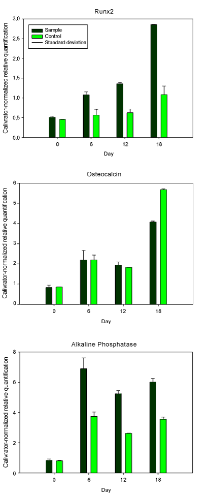 | Figure 2: Results from the calibrator-normalized relative quantization analysis of the differentiation markers RUNX2, ALP and OC with real-time qRT-PCR. Summarized osteoblasts grown with differentiation factors showed a higher level of all three differentiation markers. RUNX2 and OC showed a time dependent gene expression, while the ALP gene was high expressed already at day 6. In agreement with earlier reports, an increased time dependent differentiation was also induced in control cells (grown without differentiation factors). This differentiation could be explained by the osteoblasts' ability to spontaneous differentiate as result of high confluence in growth chambers. |