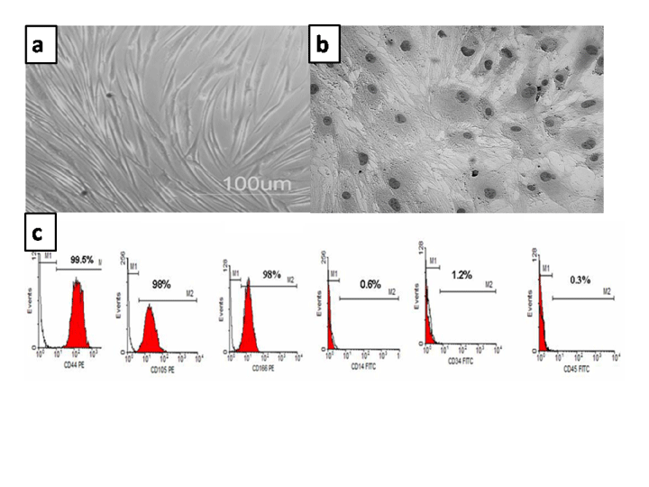 | Figure 1: Adipose derived stem cells (ASCs) in culture at passage 3. They were presented with the spindle shape appearance before differentiation (a) and appeared with rounder and cuboidal shapes after chondrogenic differentiation (b) [23]. The flow cytometric analysis of ASCs showed that more than 98% of all cells were positive for the expression of CD44, CD105 and CD166. Absence of CD14, CD34 and CD45 expressions on the surface of ASCs were observed. Filled histograms represent the specific markers (CDs) and unfilled were isotype control (Figureure 1c) [22]. |