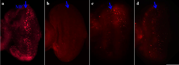 | Figure 6: Ectopic expression of dRFX3 in eye imaginal discs induced apoptosis. Detection of apoptotic cells in eye imaginal discs by immunostaining with anti-cleaved Caspase 3 antibody. (a) GMR-GAL4/+; GMR-rpr, (b) GMRGAL4/+; +/+, (c) GMR-GAL4/+; UAS-HA-dRFX3 (strain 18) /+, (d) GMRGAL4/+; UAS-HA-dRFX3 (strain 53). Arrows represent the Morphogenetic Furrow (MF). |