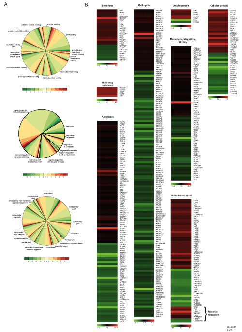 | Figure 3: Gene ontology and expression data. A) Gene Ontology (GO) pie chart of the total list of 1,405 genes classified according to molecular function (MF, upper), biological function (BP, middle), and cellular component (CC, lower); B) Heat-map (obtained using the MEV platform) showing the expression fold change of genes (with two fold or more) divided into 9 clusters according to GO terms. Red/green indicate an increase/decrease in gene expression. |