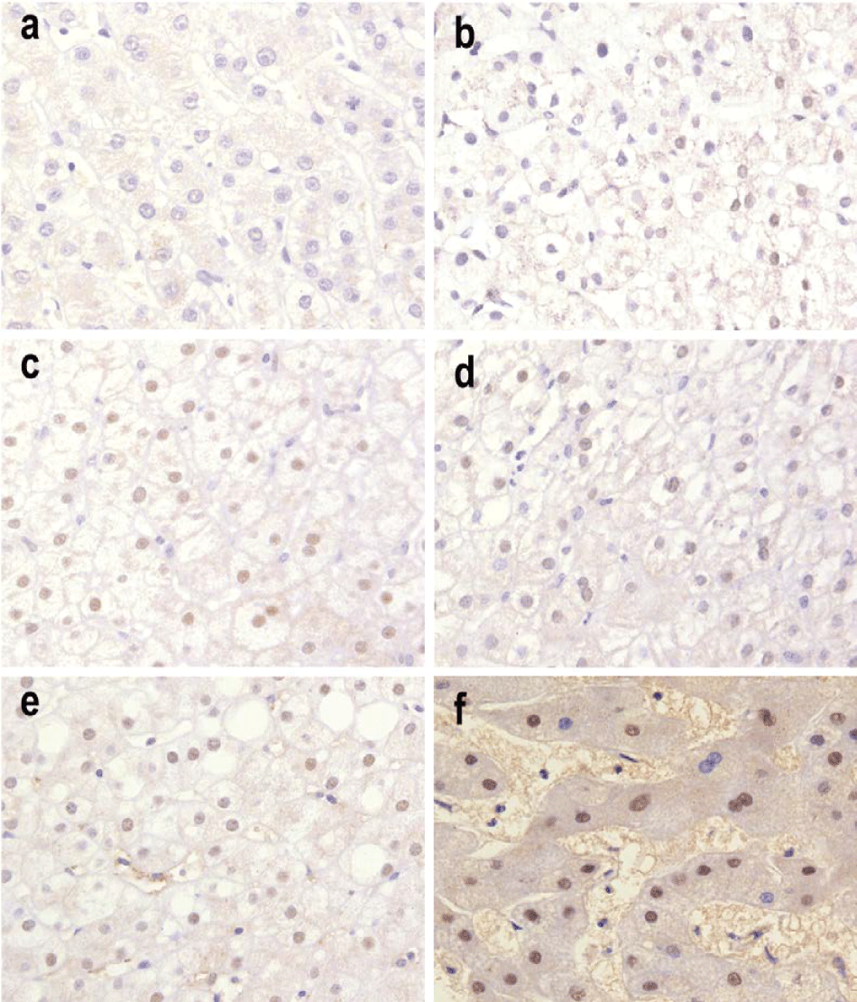 | Figure 1: Tissue sections showing the expression of c-MYC protein (nuclear staining) in liver parenchyma with CH in different fibrosis levels, which appears in brown colour. All pictures have magnification of 400x. a- there was no positive immunostaining of c-Myc (blue colour) in hepatocytes from NP; b- F0: cells with weak positive expression (+); c, d, and e- F1, F2, F3, respectively, as follows: cells with weak (+), with moderate (++), and f: F4, shows weak, moderate, and strong (+++) positive expression of c-MYC. |