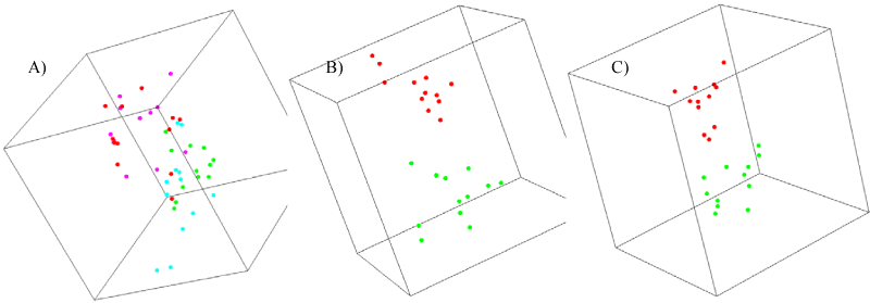 | Figure 1: Multidimensional scaling plot summarizing gene expression differences between smokers and non-smokers. Each point represents an individual sample, and the distance between two points reflects the overall similarity in expression of the selected set of genes in those two samples. A) Separation of smokers and non-smokers according to 300 genes differentially expressed between all smokers and non-smokers, irrespective of their sex. The points are colored as red (male non-smoker), pink (female non-smoker), green (male smoker) and cyan (female smoker). B) Separation of male smokers (red) and non-smokers (green) using a set of 175 genes differentially expressed in male smokers and non-smokers. C) Separation of female smokers (red) and non-smokers (green) using a set of 247 genes differentially expressed in female smokers and non-smokers. |