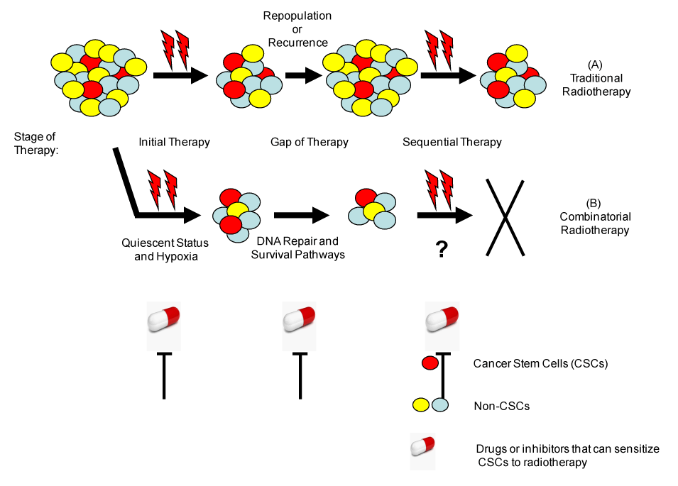 | Figure 4: A proposed model for radiotherapy approaches that can target CSCs. (A) In traditional radiotherapy, the bulk tumor shrinks after initial radiation, but the cancer cells repopulate during the gaps of radiotherapy, leading to patient relapse. (B) In combinatorial radiotherapy, drugs or inhibitors can be used to sensitize CSCs to radiation and enhance the outcome of therapy. During initial radiotherapy, the main targets may be the quiescent status of CSCs and hypoxia. Afterwards, the DNA repair mechanisms and the survival pathways become more dominant and can be targeted to prevent the repopulation of CSCs. |