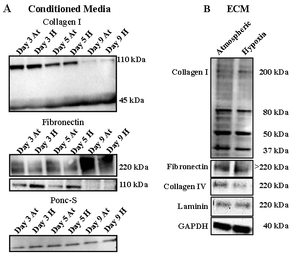 | Figure 3: Hypoxia induced changes in ECM protein expression differed depending on the context of culture. (A) Analysis of collagen I and fibronectin protein expression in the conditioned media of hypoxia and atmospheric-exposed co-cultures. Ponceau S (Ponc-S) was utilized as a loading control (B) Western blots of collagen I, fibronectin, collagen IV and laminin in the de-cellularized hypoxic and atmospheric ECM. GAPDH was utilized as a loading control. |