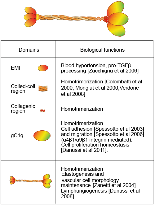 | Figure 1: EMILIN1 structure and functions. The biological properties of EMILIN1 are schematically reported in association with the respective involved domains. The regulation of elastogenesis and lymphangiogenesis has not yet been pinpointed to a specific domain although it is tempting to assume that gC1q plays an important role. |