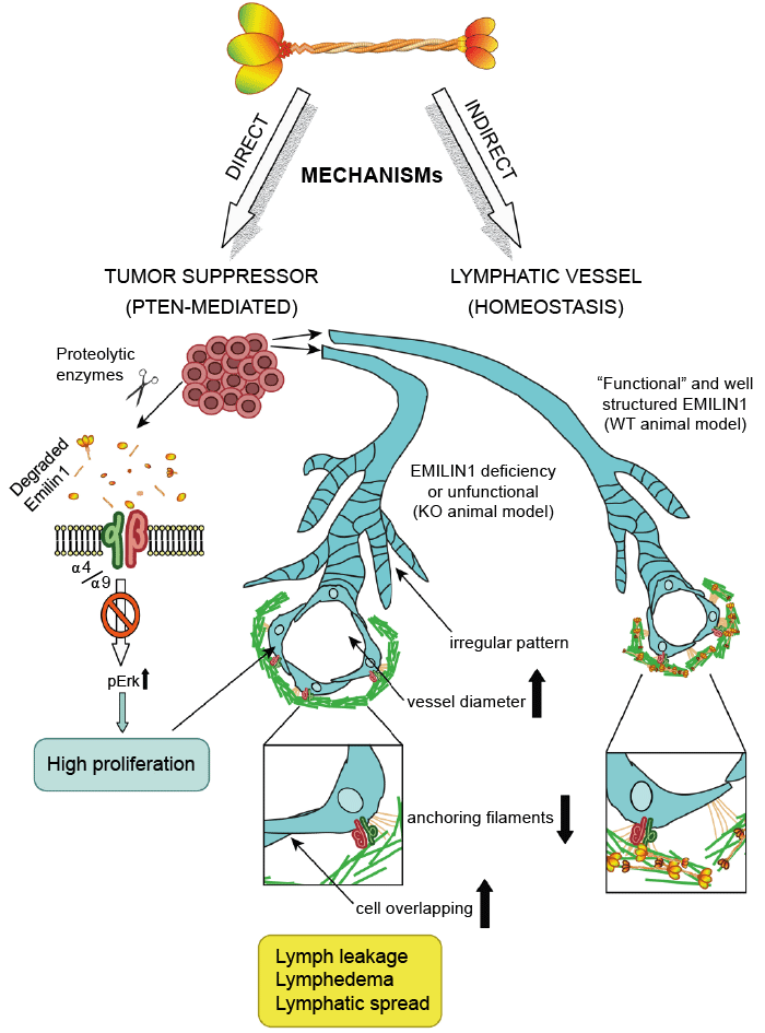 | Figure 3: EMILIN1 and tumor microenvironment. EMILIN1 exerts a direct role in tumor growth through the specific interaction with α4/α9β1 integrins. When EMILIN1 is missing or degraded by proteolytic enzymes secreted by tumor microenvironment cells (stromal or inflammatory cells), the PTEN-mediated tumor growth suppressor function is lost. The dissemination of cancer cells in an EMILIN1-negative microenvironment (loss of function or protein deficiency) is indirectly favored by the structural defects of lymphatic vessels that display an irregular pattern, an increased vessel diameter, and a reduced number of anchoring filaments. These structural alterations determine higher lymphatic vessel permeability and render lymphatic vessels more permissive to the entry and exit of cancer cells. In addition, the lack of EMILIN1/ integrin interaction results in an increased proliferation of LECs. Thus, there are more and not functional lymphatic vessels to facilitate cancer spreading. |
