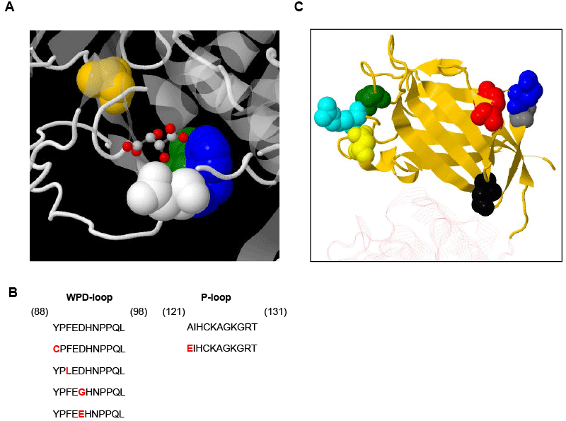 | Figure 3: Mutations of tumor suppressor PTEN in HNSCC. Crystal structure of PTEN protein is represented as ribbon diagrams. A. The functional active pocket of the phosphatase domain is shown. The mutated residues in the WPD-loop are highlighted in green (Y88), blue (F90), and white (D92). The mutated residue A121 is in yellow.B. Mutated residues Q245 (in blue) and R335 (in cyan) in the C2 domain are nonsense mutations. Y225, P246, and D252 are shown in red, gray, and black respectively. M205 (in green) is in the Cs1/2 loop; and D331G (in yellow) is in the C2α loop. C. Sequence of the WPD-loop and P-loop depicting the mutated residues within the walls of the active pocket present in the PTEN phosphatase domain. Mutated amino acid residues are in red. |