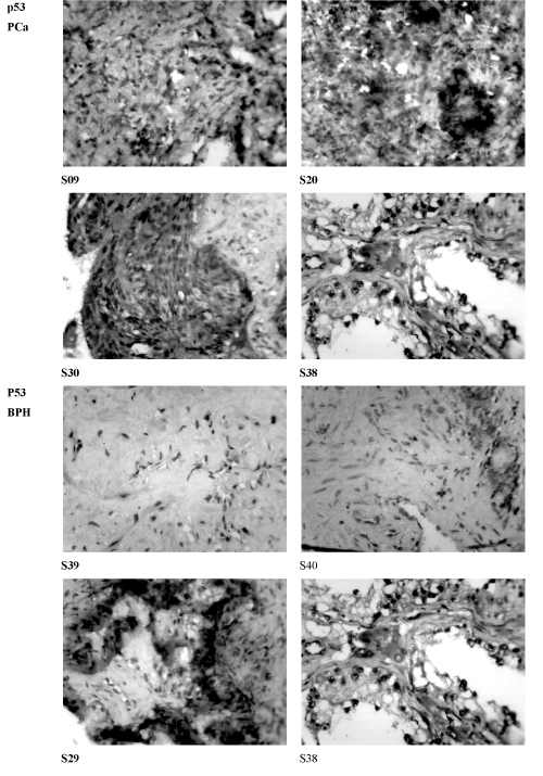 | Figure 2: Biopsies treated with anti-Human p53 (Mab) in immunohistochemistry aimed at demonstrating the expression levels of p53 in 4 BPH and 4 PCa biopsies. S38 represents the control having moderate positivity around the basement membrane. This can be likened to p53 expression in regular cell division and is therefore tagged (-/+). In PCa biopsies, p53 expression was immunopositive (+) while it is highly immunonegative in BPH (-). Although few cells scattered at wide intervals showed the cytoplasmic inclusions. The biopsy tagged S29, although diagnosed as BPH, showed high expression levels of p53 similar to that observed in clinically diagnosed PCa biopsies (S29/+). |