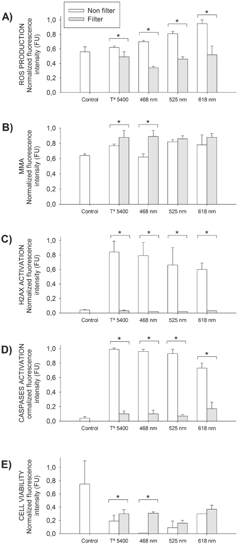 | Figure 2: Photoprotective effects of blue light absorbing filter on human RPE cells in vitro. HRPEpiC cells were exposed to white (Ta5400°K), blue (468 nm), green (525 nm) and red (616 nm) LED lighting (irradiated cells) in the presence or not of a blue light absorbing filter for 3 light-darkness cycles (12 hours/12 hours). Control groups consisted of RPE cells kept in darkness. The graph displays mean normalized fluorescence intensity radios of protected cells versus non protected cells. Bars represent mean ± SD from n=3-5 experiments. (A) ROS production determined by the H2DCFDA staining. (B) Mitochondrial membrane potential determined by the TMRM staining. (C) DNA damage determined by the activation of H2AX histone. (D) Apoptosis determined by the activation of caspase-3. (E) Cellular viability of HRPEpic cells determined by labeling all nuclei with DAPI. *p<0.05, t-student test. |