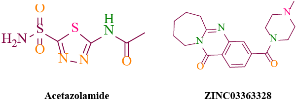 | Figure 6: Geometric constraints of hydrogen bond donor/acceptor atoms for CAIX inhibitor Acetazolamide and novel hit (ZINC03363328) defined at AutoDock 4.2. The pink atom represents sp3 donor/acceptor atoms while orange and green represent sp2 acceptor and donor atoms, respectively. |