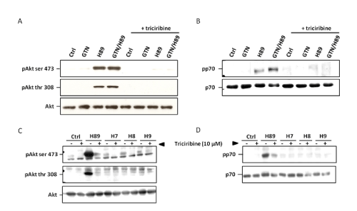 | Figure 3: Triciribine abrogates the specific activation of Akt/mTOR signaling pathway by H89. SW480 cells (3 × 105/mL) were pretreated for 1 h 30 with triciribine (10 μM) before exposure to GTN or/and H89 (10 μM each) for 24 hours. (A) Western blot analysis of Akt, pAkt ser 473 and pAkt thr 308 expression, (B) Western blot analysis of p70 and pp70. (1 representative of 3 independent experiments). (C and D) SW480 cells (3 × 105/mL) were pretreated for 1 h 30 with triciribine (10 μM) before exposure to H89, H7, H8 and H9 (10 μM each) for 24 hours. Total protein was isolated and subjected to western blot analysis for (C) Akt, pAkt ser 473, pAkt thr 308 expression (longer exposure of films has been required to detect slight expression of pAkt), (D) Western blot analysis of p70 and pp70 expression (1 representative of 3 independent experiments). |