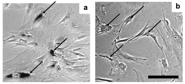 | Figure 1: Primary culture of human microvascular endothelial cells (HMEC). A representative colony of microvascular endothelial cells associated with anti-CD31 beads 24h after isolation (a), and after the fi rst passage (b). There were no cells not associated with CD31 beads that would represent contaminating cells. Images were obtained using an inverted phase contrast microscope (scale bar: 50 µm). Arrows show beads attached to cells. |