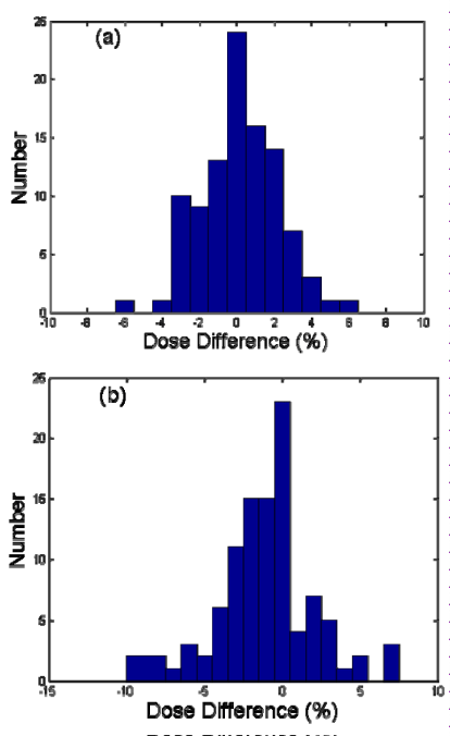 | Figure 2: Both plots show the independent dose calculation result from 100 helical tomotherapy patient plans with MU-Tomo. (a) Second check results without shifts (non-shift dose differences). (b) Dose difference consequences with systematic inter-fraction setup shifts. |