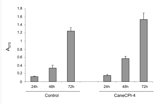 | Figure 2: CaneCPI-4 does not modulate B16F10-Nex2 melanoma cell proliferation. B16F10-Nex2 melanoma cells (103) were plated in 96-well plates and incubated with CaneCPI-4 at 1 mM in complete RPMI medium. Cell viability was measured using MTT reagent. Error bars, SD of quadruplicate determinations. |