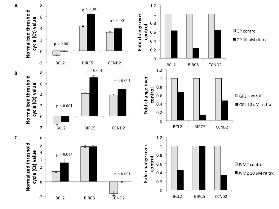 | Figure 2: Effects of ritonavir treatment on NFκB target transcripts in MCL. Effects of 6 hours treatment with 10 μM ritonavir on the mRNA expression levels of NFκB targets BCL2, BIRC5 (survivin), and CCND2 (cyclin D2) in GP (A), GRL (B), and JVM2 (C), as assessed using real time PCR. GP, GRL, and JVM2 cells (1 x 106 cells) were treated with 10 μM ritonavir for 6 hours. Cells were then spun down and RNA isolated via Trizol. RNA was used for subsequent cDNA preparation and transcript-level analyses. Graphs on the left show threshold cycle (Ct) values of transcripts, normalized to the housekeeping control gene transcript HPRT. Graphs on the right show the correlative fold changes between untreated and treated cells. |