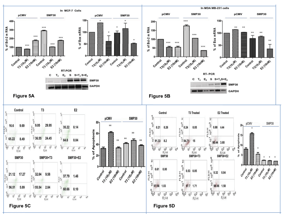 | Figure 5: Induction of apoptosis as a result of T3 Mediated repression of hSMP 30 in contrast to absence of any significant induction of apoptosis as result of E2 mediated repression of hSMP 30. (A,B) A representative qRT-PCR data for two apoptotic related genes BCL-2 and BAX expression in MCF-7 and MDA MB-231 cells. Shown are the mean of triplicate samples (mean ± SD) normalized to GAPDH. CT values obtained from the real time PCR was used to compare the expression label of treated sample from control assuming 100% amplification. Results were confirmed in three independent experiments. P<0.0001 difference from only vector transfected control using ANOVA for BCL-2 gene, P<0.0232 difference from control using ANOVA for BAX gene expression in MCF-7 cells. P<0.0001 difference from only vector transfected control using ANOVA for BCL-2 gene, P<0.001 difference from control using ANOVA for BAX gene expression in MDA MB-231 cells. Over expression of SMP30 gene after transfection has been confirmed by RT-PCR. SMP30 gene in (upper panel) and GAPDH gene in (lower panel) are shown using cDNA from MCF-7 and MDA MB-231 cells. (C,D) Apoptosis was assessed post vector/SMP30 cDNA transfection and E2/T3 treatment by flow cytometry. Shown are the mean of triplicate samples ± SD normalized to control. Similar findings were found in two other experiments, P < 0.001 difference from only vector transfected control using ANOVA in Figure 5C and P < 0.01 difference from only vector transfected control using ANOVA in Figure 5D. |