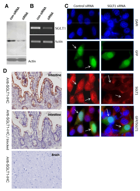 | Figure 2: Characterization of the SGLT1-IHC antibody using HCT116 human colon cancer cells. A, Western blot analysis of endogenous SGLT1 in cells transfected with control shRNA or SGLT1 shRNA using the SGLT1-WB antibody, which was consistent with the changes of SGLT1 mRNA levels determined by RT-PCR B, Actin was used as internal controls. C, Immunocytochemical analysis of cells transfected with control shRNA or SGLT1 shRNA using SGLT1-IHC. Cells containing shRNA appear green (arrows) due to the expression of GPF under the control of an autonomous promoter and the SGLT1 signal is red. Nuclei are stained blue with DAPI. D, Immunohistochemical analysis of a human normal intestine sample using SGLT1-IHC with or without blocking peptides (1 mg/mL). |