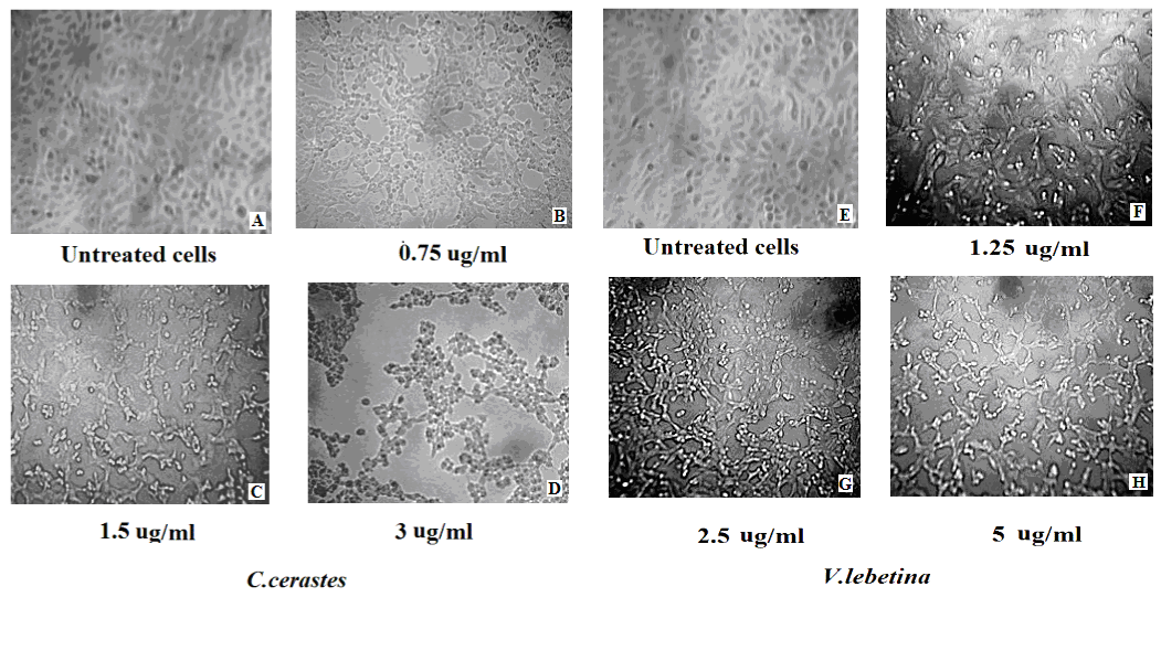 | Figure 2: [A-H]: Monitoring of morphological changes in MCF-7 cells post treatment with C.ceratstes and V.lebetina venoms relatively to concentrations 24 h post treatment [A and E]: Untreated cell control; [B]: cells treated with C.cerastes (0.75 μg/ml); [C]: cells treated with C.cerastes (1.5 μg/ml); [D]: cells treated with C.cerastes (3 μg/ml); [E]: cells treated with V.lebetina (1.25 μg/ml); [F]: cells treated with V.lebetina (2.5 μg /ml); [G]: cells treated with V.lebetina (5 μg /ml) showing distinct cytotoxic effect of test venoms with larger areas of detached cells along with increasing venom concentrations compared to the normal appearance of untreated MCF-7 cells. |