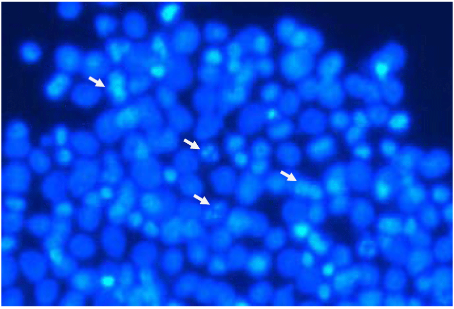 | Figure 23: PC3 cells treated with 50ng/ml DR5 captured through fluorescent imaging. Apoptotic cells [bright spots] have been indicated with white arrows. In this case, the PC3 cells were treated with 50ng/ml DR5 and were incubated for 24 hours before being stained. The treatment with 50ng/ml DR5 obtained 50.67% of apoptotic cells. |