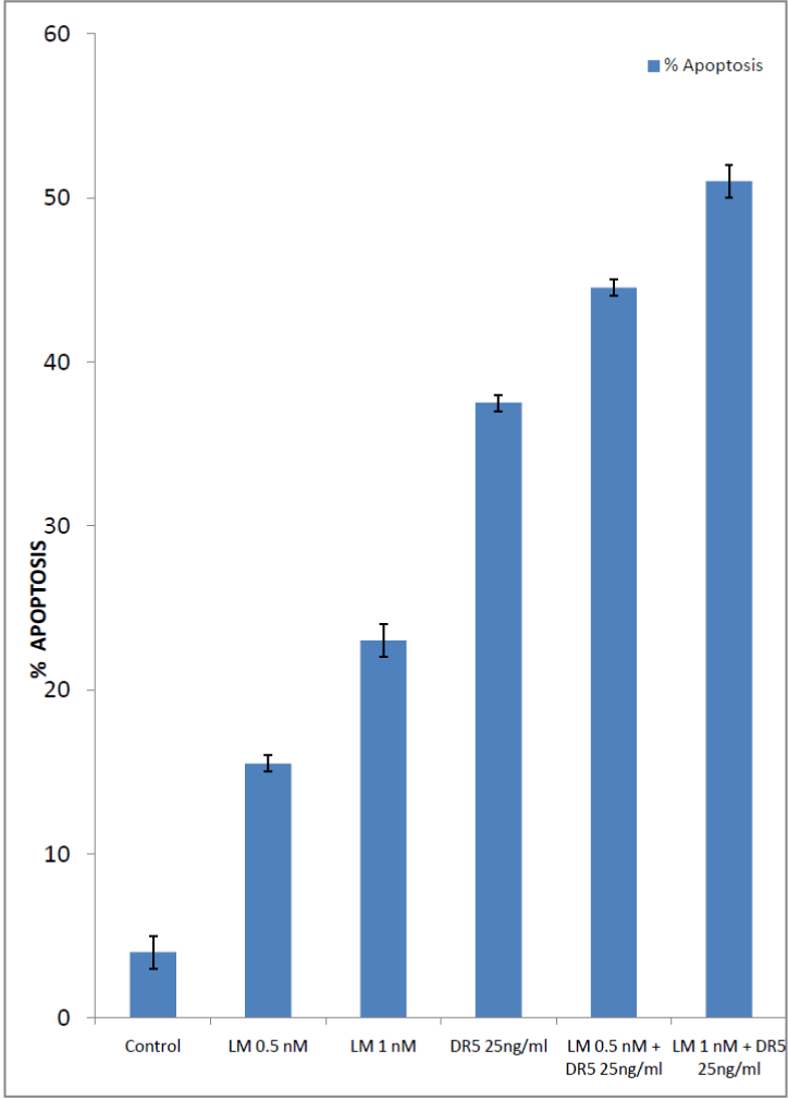 | Figure 40: Effect of leptomycin and DR5 on LNCAP cells. This graph depicts effect of leptomycin, DR5 and their combination in varying concentrations on LNCAP cells. In this experiment, LNCAP cells were plated at 10,000cells/ml in a 6 well plate and incubated for 24 hours. These were then treated with varying concentrations of leptomycin B, DR5 and their combinations and incubated for 24 hours. Images of cells were captured before and after incubation with drugs through light microscopy for calculating percentage apoptosis. |