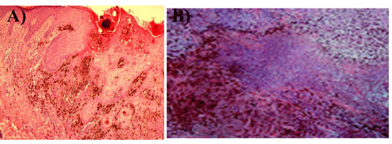 | Figure 2: The histopathology of the primary site of the cutaneous melanoma of patient # 8: (A) Prior to intralesional biotherapy from the biopsy site, and (B) One week after intralesional therapy from the resected tissue of the same patient. Note the massive tumor necrosis and the abundant pigmented histiocytes. (H&E X400). |