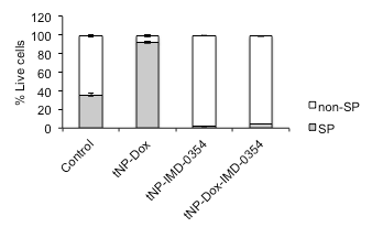 | Figure S1: Effects of drug loaded tNPs in vitro on side population of CSCs. Both side population (SP) of CSCs and non-side population (non-SP) of bulk cancer cells were measured by FACS and Hoechst 33342 dye efflux in A549Luc cells after treatment in vitro with tNP-Dox, tNP-IMD-0354 or tNPDox- IMD-0354, and compared to control. Data are shown as mean ± SEM. |