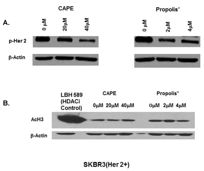 | Figure 6: Propolis/CAPE decreases p-Her2 in SKBR3 cells: SKBR3 cells were treated with CAPE or Propolis for 24 h and western blotting performed (Figure 6A). There is a concentration-dependent decrease in p-Her2 protein expression by both CAPE and propolis (normalized for CAPE content). No hyperacetylation of histone protein was observed in the SKBR3 cell line with the antibody used (Figure 6B). |