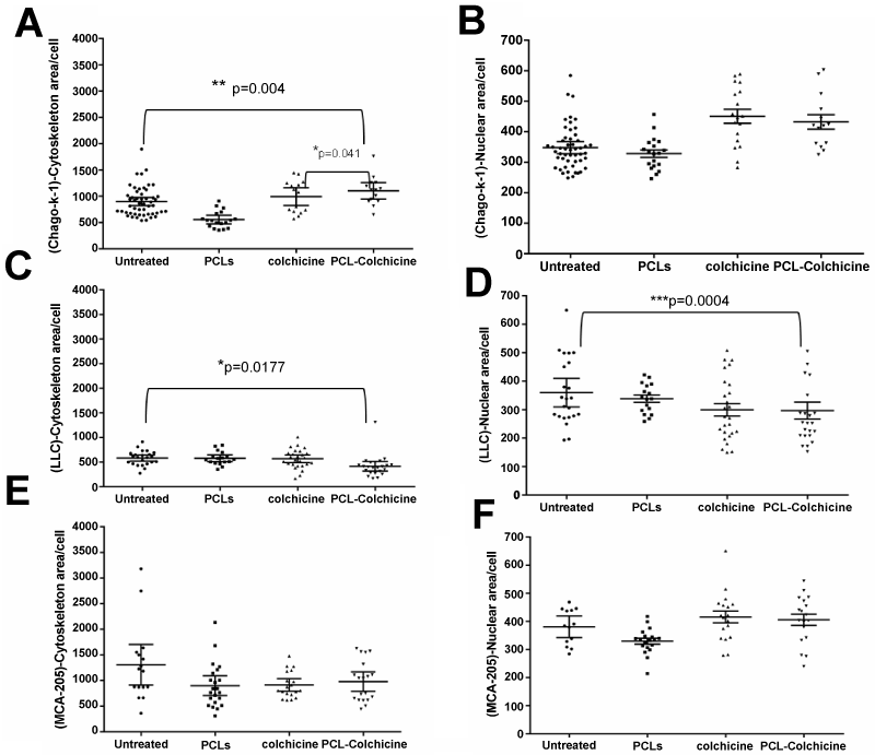 | Figure 3: The fluorescence images show the qualitative effect of DOTAP-PCLs, free colchicine and DOTAP-PCL-colchicine against various cancer and endothelial cell lines. The cytoskeleton (green) and nucleus (blue) of the cell were captured using 40X magnification. Magnification bar = 7 µm. |