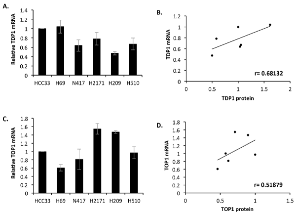 | Figure 2: Small cell lung cancer cell lines display good correlation between TDP1 or TOP1 protein level and mRNA. cDNA from each of the SCLC lines was generated from 1 μg purified mRNA using the Superscript First Strand RT-PCR and real time PCR analysis was conducted using TDP1 primers (A) or TOP1 primers (C) and an MX3005p qPCR system. The relative quantity of mRNA (RQ value) for each repeat experiment was calculated according to the equation RQ = 2ΔΔCT and the RQ values normalised to that obtained for the HCC33 cell line. The average of normalised RQ values from 3 independent experiments ± STD is depicted (A&C). A graphical representation of the Pearson’s correlation coefficient (r) between SCLC TDP1 protein levels and TDP1 mRNA is shown in (B) and that for SCLC TOP1 protein level and TOP1 mRNA is shown in (D). |