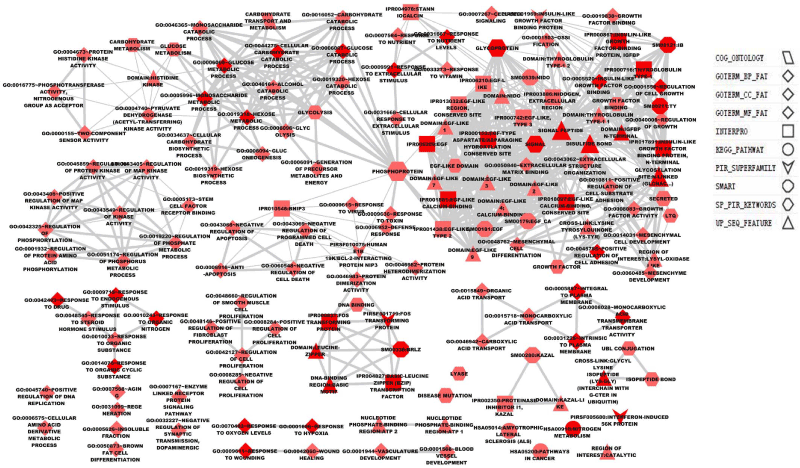 | Figure 2: Visualization of results from Functional Annotation Chart for the differentially expressed genes using the Enrichment map of Cytoscape. Each node represents a significant functional term with its size corresponds to number of genes. Edges indicate gene overlap between nodes, where the thickness indicates the size of the overlap. |