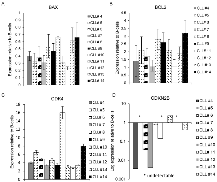 | Figure 2: Real time PCR analysis of selected genes in CLL specimens: BAX, BCL2, CDK4, and CDKN2B RNA were analyzed in primary CLL specimens with Taqman probes and real time PCR. All the data is relative to the expression in B cells isolated from normal donor PBMCs (n=3, mean and SD). |