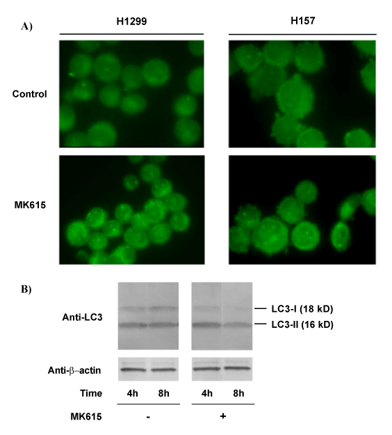 | Figure 3: (A) Autophagosome formation by MK615 treatment (10 μl/ml) in the H1299 and H157 cell lines for 6 h. An increase of LC3 expression was clearly observed after 6 h treatment in both cell lines, as compared to the nontreatment control. (B) Western blot analysis of LC3 expression in MK615- treated (10 μl/ml) and untreated H1299 cells for 4 and 8 h. The ratios of the LC3-II/LC3-I levels were increased at 4 and 8 hMK615 post-treatment, as compared to the non-treatment control. ß-Actin expression levels were used as a loading control. |