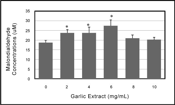 | Figure 2: Garlic extract (GE)-induced oxidative stress in human leukemia (HL-60) cells. Cells were incubated for 12 hr with increasing concentrations of GE (2, 4, 6, 8, and 10 mg/mL). Malondialdehyde (MDA) concentrations were determined as described in Materials and Methods. *Significantly different from the control by ANOVA Dunnett’s test; P < 0.05. Data are representative of 3 independent experiments. |