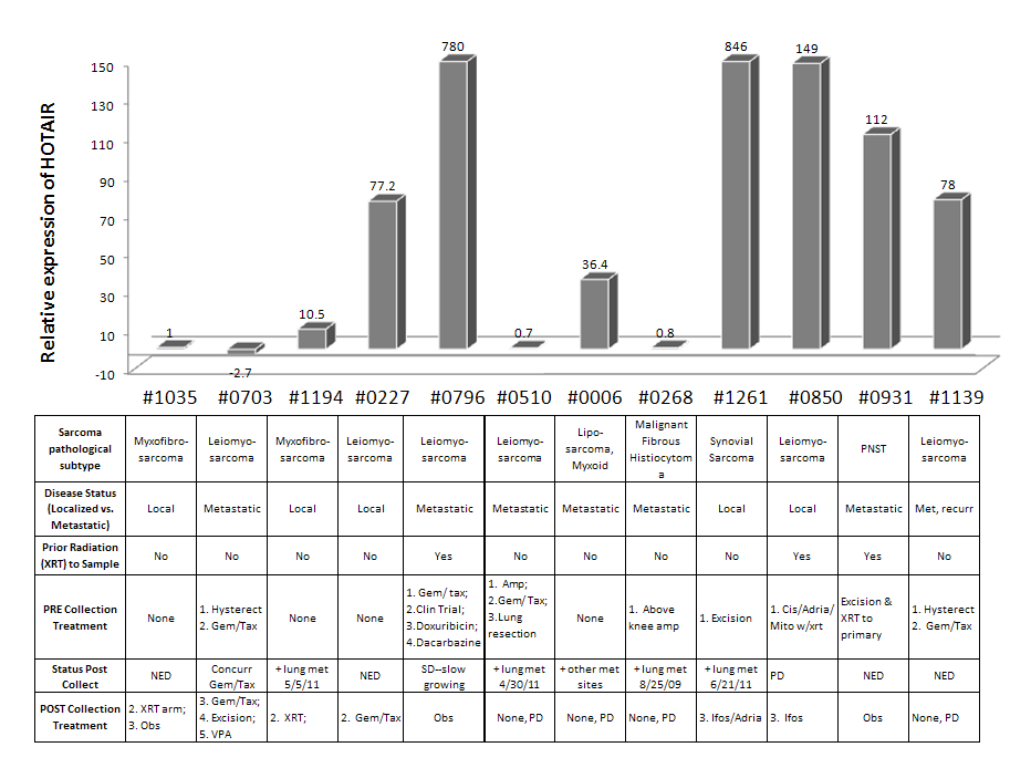 | Figure 2: Expression of HOTAIR in primary or metastatic cancer tissues from sarcoma subjects. Expression of the long noncoding RNA HOTAIR was detected by qRT-PCR in cancer tissues from twelve subjects with primary or metastatic sarcoma. Samples are normalized to 18S rRNA. |