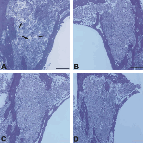 | Figure 6: Representative cross-sectional views of SGNs . Consecutive Cis injection caused myelin sheath detachment in some SGNs; cell density did not decrease (a). Arrows show affected SGNs. No SGN damage was seen in any of the coadministration subgroups (b, c, d: Cis at 0.1, 0.2, and 2 mg/kg, respectively, observed 7 days after drug administration). Scale bar: 50 μm. |