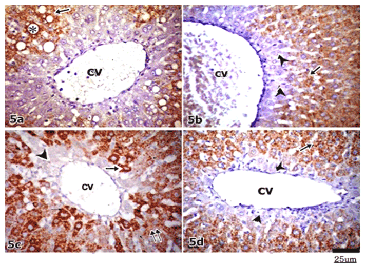 | Figure 5: Micrograph of immunoperoxidase technique for Hep Par-1 in both group II & III. (a): Shows heterogeneous granular cytoplasmic immunoreactivity (arrow) of hepatocytes with stronger expression around fatty vacuoles (asterisk). A wide area of negative immune expression (arrowhead) is seen around the central vein (cv), Subgroup IIA. (b): shows hepatocytes with moderate cytoplasmic immunoreactivity (arrow). A relatively wide area of negative immune reaction (arrowhead) is noticed around the central vein (cv). Subgroup IIB. (C): shows patchy immunoreactivity. Some hepatocytes showing strong immune reaction (arrow), others express weak reaction (double arrow). An irregular area of negative immune reaction (arrowhead) around the central vein (cv) is noticed. Subgroup IIIA. (d): shows moderate immunoreactivity in the cytoplasm of most hepatocytes (arrow) except a negative narrow zone (arrowhead) around the central vein (cv), Subgroup IIIB. |