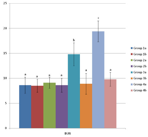 | Figure 5: Serum BUN (mg/dl) levels in the Control rats orally gavaged with 0.5ml saline water for 60 days (Group 1a), Control rats withdrawn from oral gavage with 0.5 ml saline water for 60 days (Group 1b), Control rats orally gavaged with 0.5 ml of vegetable oil for 60 days (Group 2a), Control rats withdrawn from oral gavage with 0.5 ml of vegetable oil for 60 days (Group 2b), Test rats orally gavaged with 4.0 mg/kg bw of gasoline fuel for 60 days (Group 3a), Test rats withdrawn from oral gavage with 4.0 mg/kg bw of gasoline fuel for 60 days (Group 3b), Test rats orally gavaged with 4.0 mg/kg bw of diesel fuel for 60 days (Group 4a) and Test rats withdrawn from oral gavage with 4.0 mg/kg bw of diesel for 60 days (Group 4b). Each value represents mean ± SEM; n = 6; bP≤ 0.05 compared to a & c; cP≤ 0.05 compared to a. |