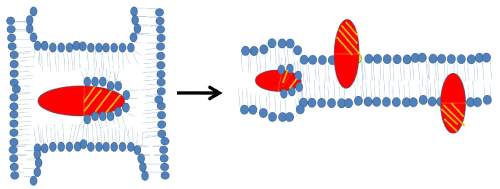 | Figure 3: Schematic diagram of a model by which cardiotoxins can form inverted micelles and translocate inside lipid bilayers. Cardiotoxin can imbed inside an inverted micelle (left panel) when trapped between two liposomes or two lipid bilayers (Figure 2). Cardiotoxins can also imbed inside cell membranes to form a transient inverted micelle from which the cytotoxin translocates to either the outer or the inner leaflet of the lipid bilayer with the hydrophilic portion (shaded) exposed to the bulk solvent while the hydrophobic region (non-shaded) of cardiotoxin interacts with phospholipid tails. |